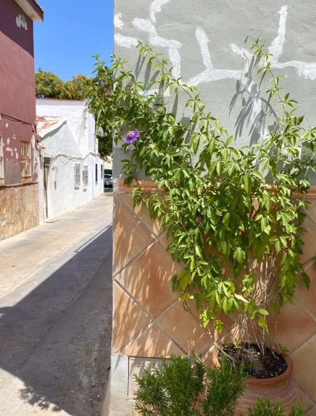 生活できるなんて〜。門がかすんで見える(笑)。ぼこぼこした手触りの白壁やタイルが、温かくていい感じ。それで、窓枠やドアが青だったりして、コントラストがいいんだよね。