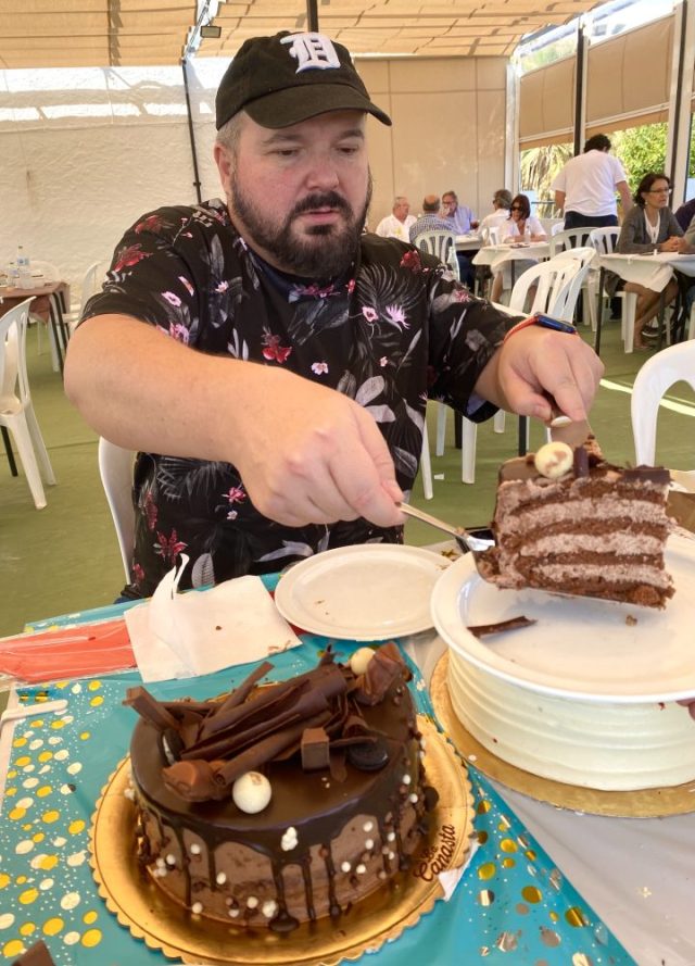 これで5人分(笑)。狂喜乱舞。さっそくダビーによるケーキカットセレモニー。実は「チョコレートケーキがいい」と頼まれ、お店のお姉さんに
