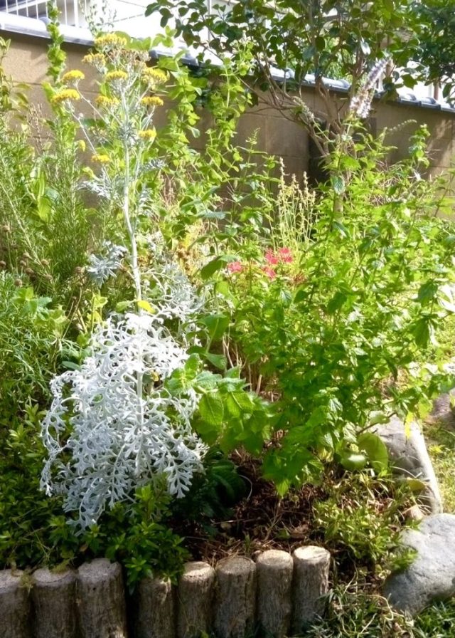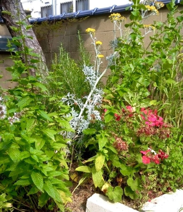なっているらしい。写真を見てびっくり。庭の一角がもさもさと、高さ1メートル近くの藪になっている。ガーデンセンターで買った小さな鉢たちが、まあよくここまで。ぽつぽつと植えたはずなのに