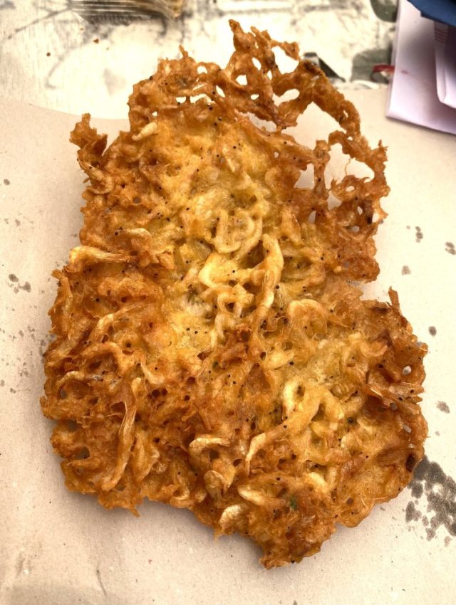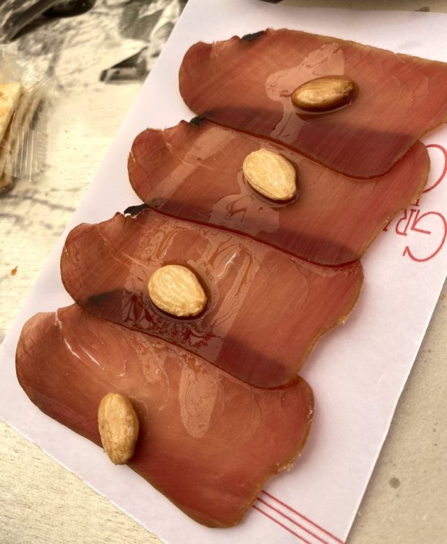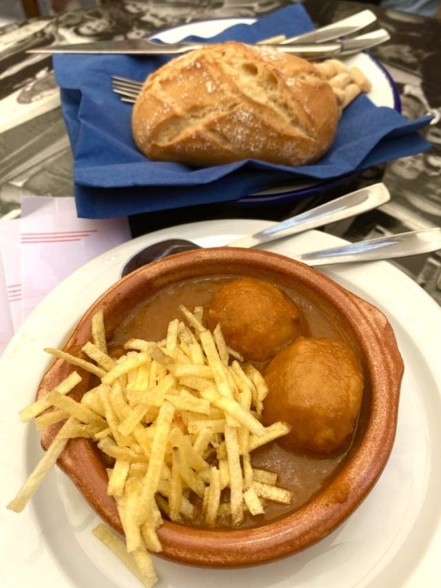 マルーカとは魚のからすみ(薄切りにして、アーモンド&オリーブオイルで食べる)。これがビールに合うのだ〜。さらに肉団子ならぬ魚団子、かき揚げみたいな熱々のトルティージャ・・・