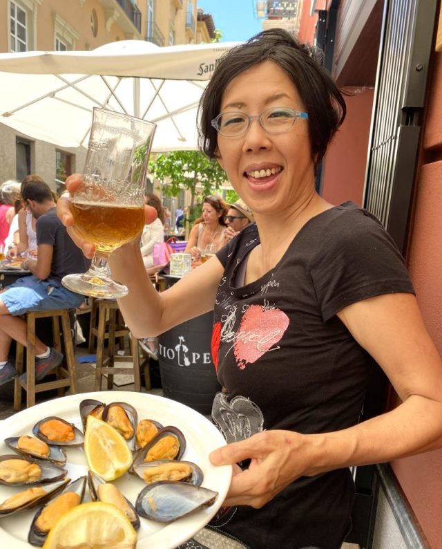クリスティーナの提案で、庶民的なバルへ。レストランと違い、こんな樽のテーブルで。テラス席で風に吹かれながら、ビールで乾杯(←こればっかり)。