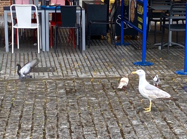 でかっ(笑)。小鳥にパンくずを、って感じじゃないな〜。鳩の5倍くらいの大きさで「獣感(けものかん)」がすごい。勢いよく走り回るので、やたらと目立つ。この争奪戦に