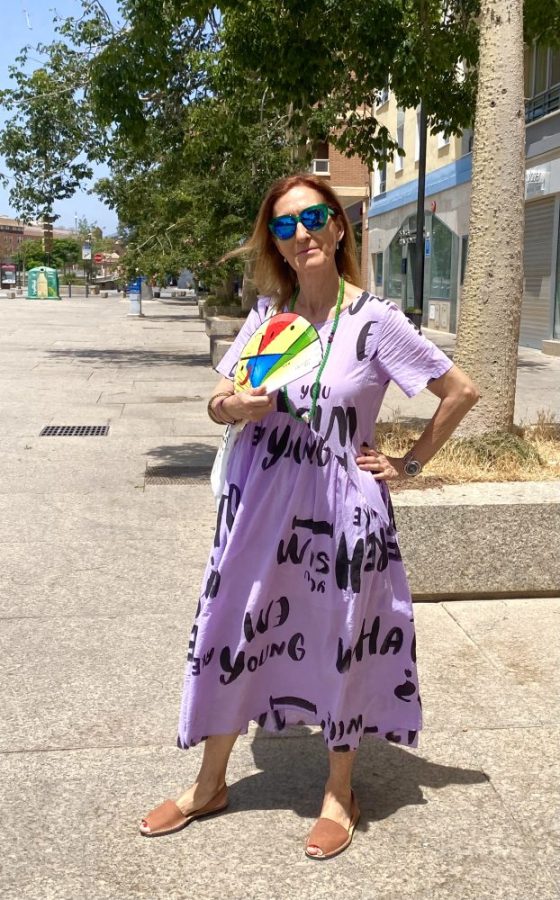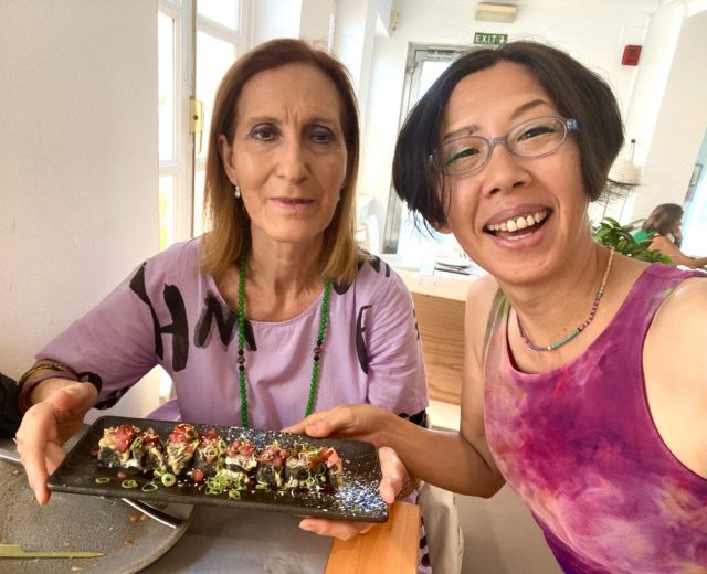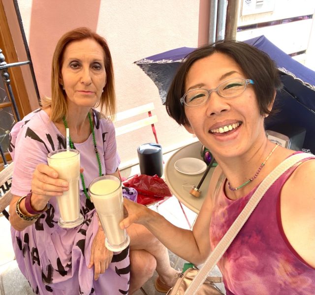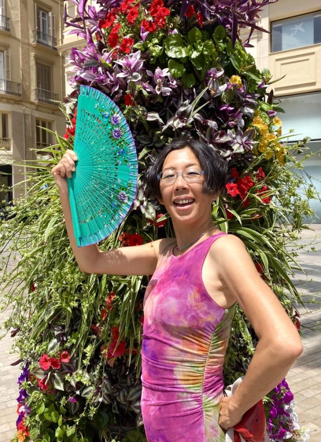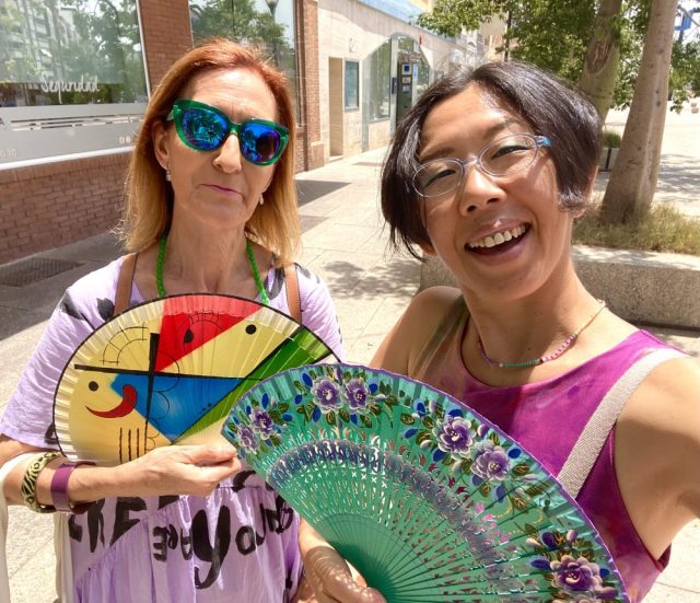 テンション上がる〜(笑)。姿勢までぴしっと。待ち合わせの場所に着くと、まぁ、2人とも扇子を片手に。これぞマラガ女子。色とりどりの扇子がはためく〜。