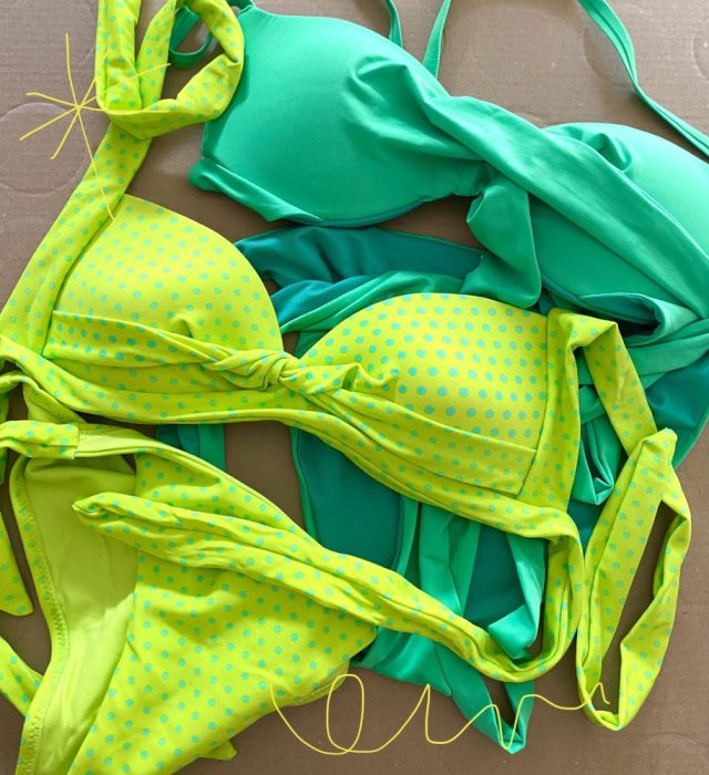それどころではないのさ〜。さて。お店に入るや、私の大好きな黄色と緑色のビキニを発見。これが試着したら、いきなりぴったり〜。きゃー。