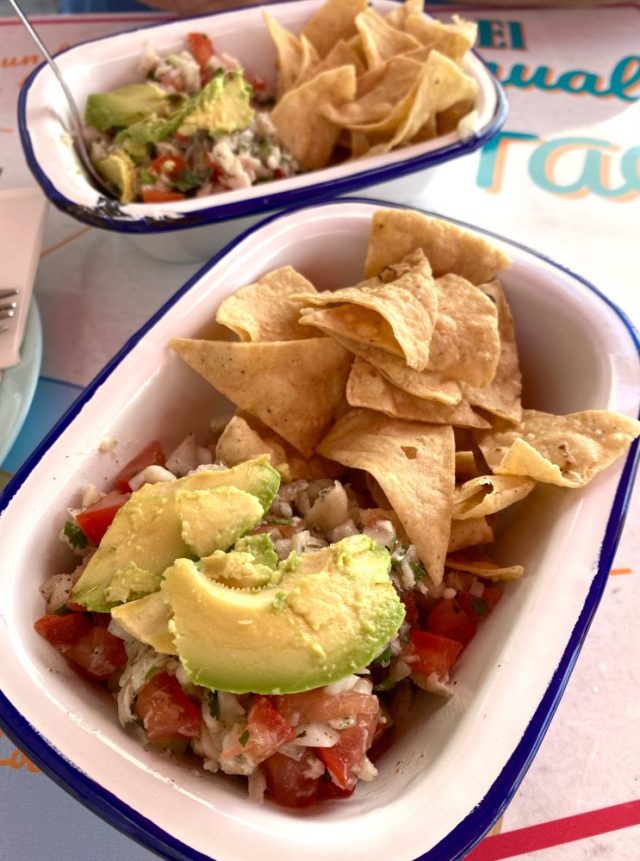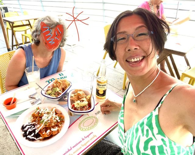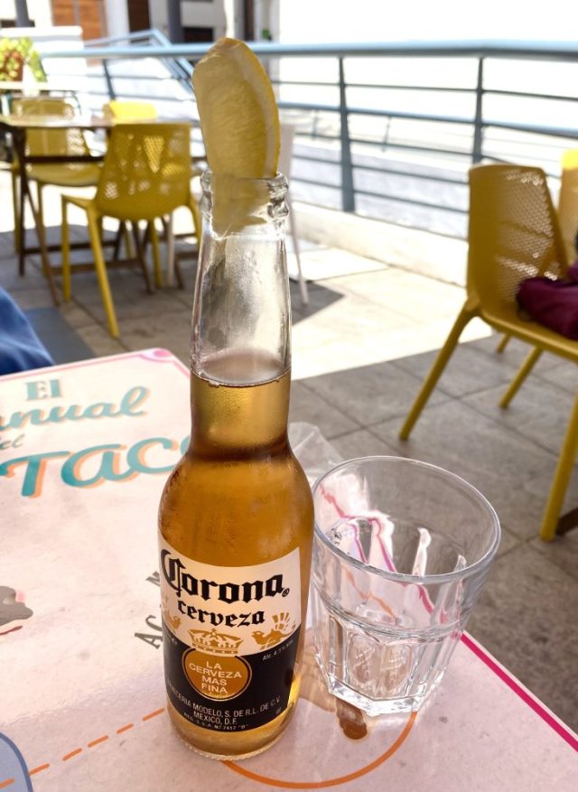 インマの行きつけテラス席。仕事帰りに、ふらりと寄るお店らしい。セビーチェやピリ辛チキンなどつまみながら、コロナビールで乾杯(残念ながらインマの写真はNG)。