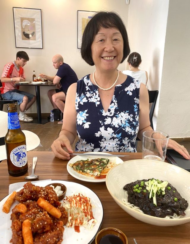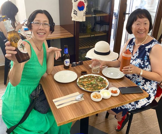 とタイトルをつけてくれた(笑)。さて。本日は韓国料理店。冷房のある屋内席でひんやり〜。中・韓国文化に強い千恵さんに、料理のセレクトはお任せ。