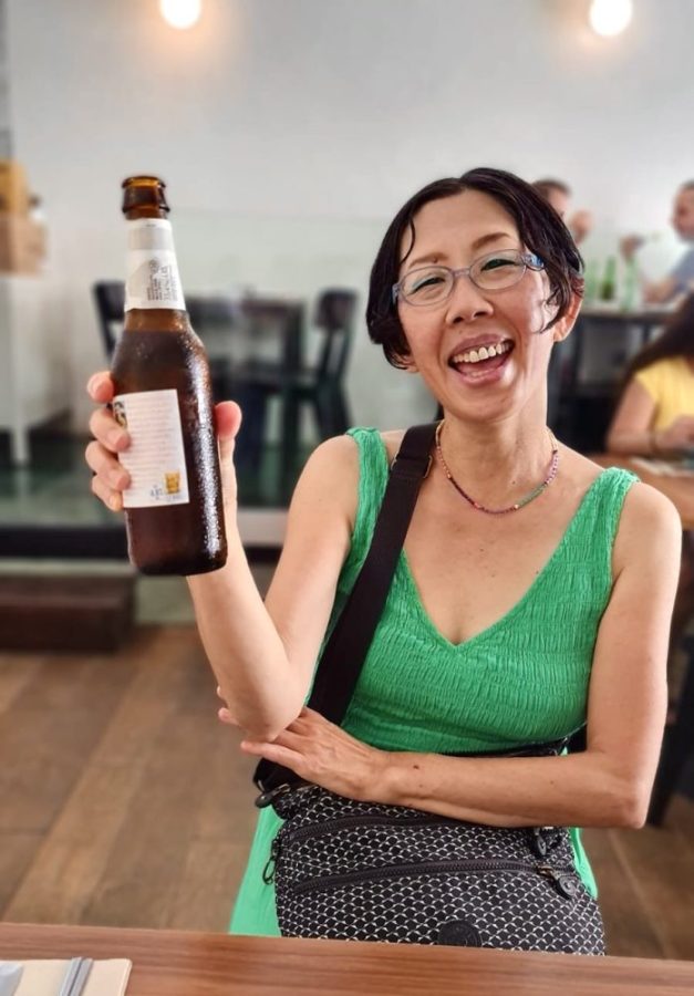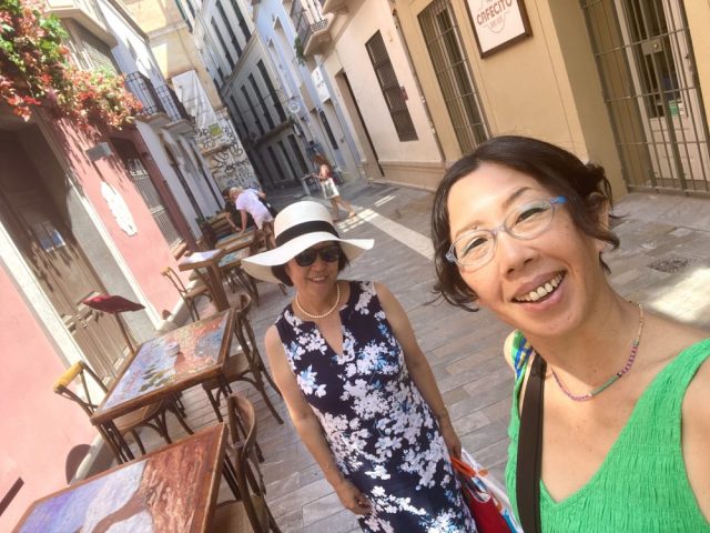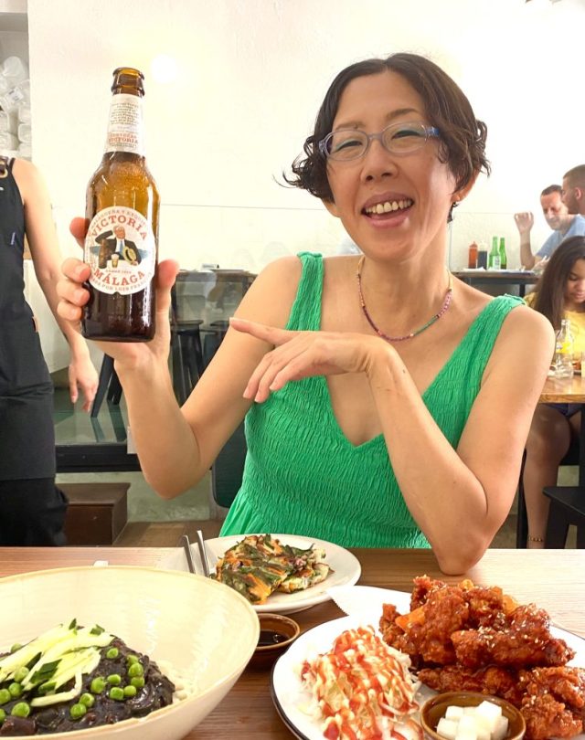 めちゃうま〜。その時の、私の表情がこちら(写真8枚目)。うれしそうやなー。まるで海から上がった海坊主みたい(笑)。びっしょり。マラガのビール「ビクトリア」を手に。千恵さんがこの写真に
