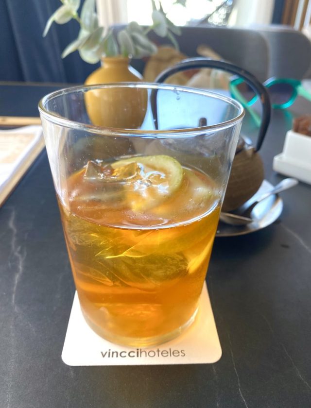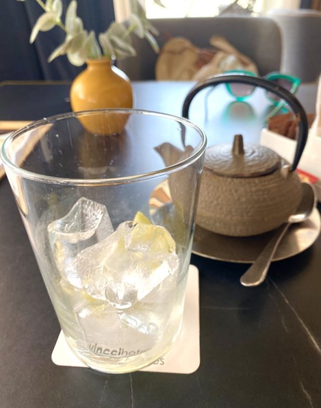 暑すぎて〜(笑)。アイスティの氷もすぐに溶けそうやー。ホテルなので快適なソファ椅子。これっしょ。身体に優しいよね。クッションなしの固いイスは、どんなにおしゃれでもイヤだなぁ。