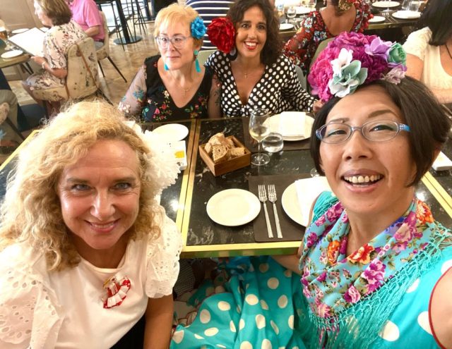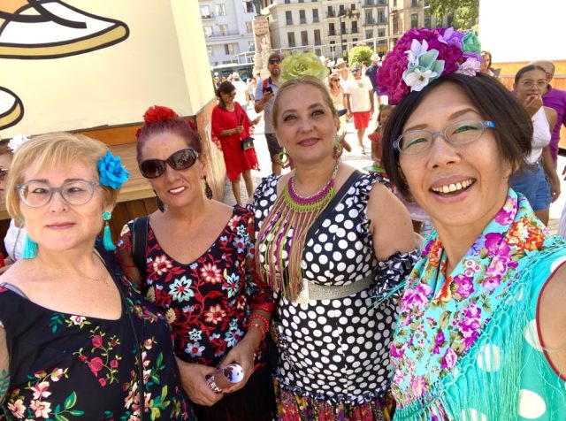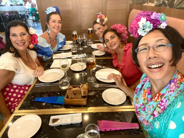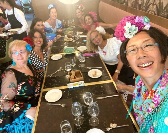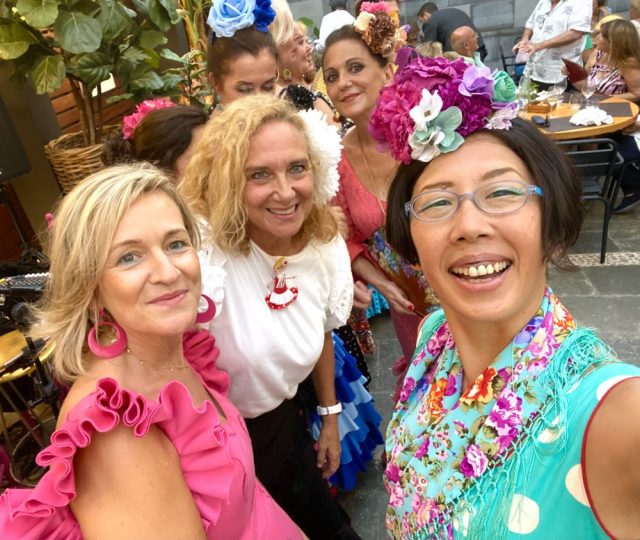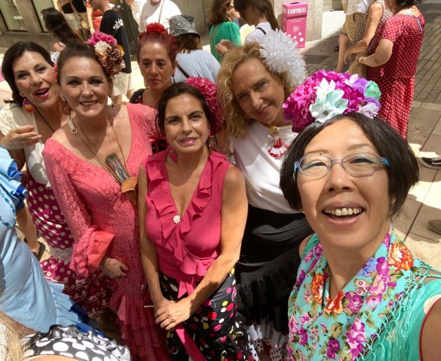 先生のカスタネットに合わせて、通りでセビジャーナスを踊る。気持ちいい〜。やっぱ、通りで踊ってこそ!これぞフェリア。あっという間に、私たちの周りにも人垣が。
