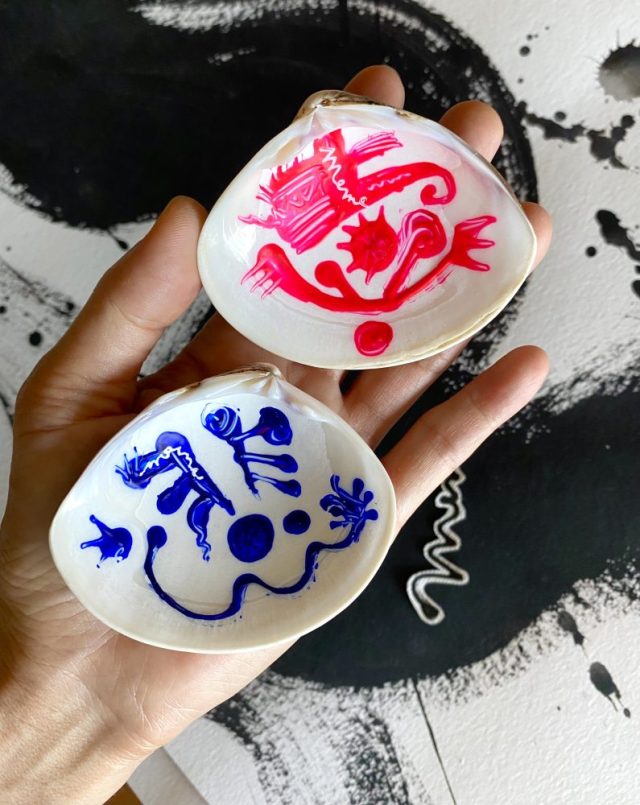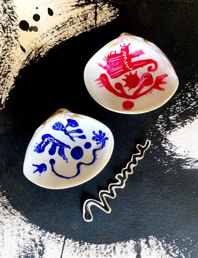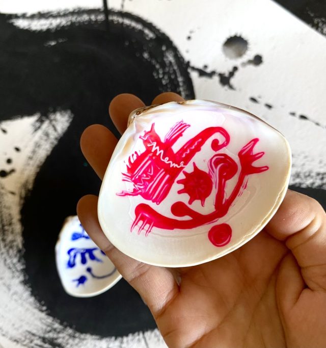 「喜」「悲」文字。ふたつでひとつ。貝アート。喜びも悲しみも、どちらかだけってことはけしてない。この世の全ては、よくも悪くも変わり続ける。
