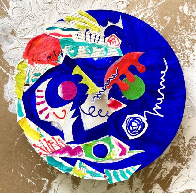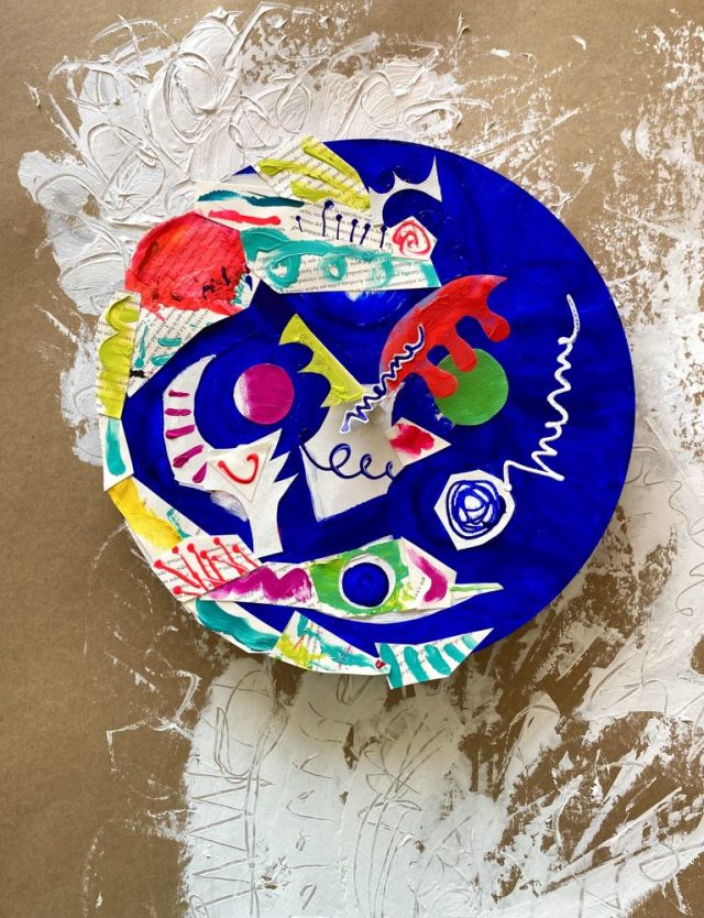 時計アート。ほとんど時計に見えないと思いますが、赤と黄色のパーツが長針と短針(電池を入れればちゃんと動くはず)。
