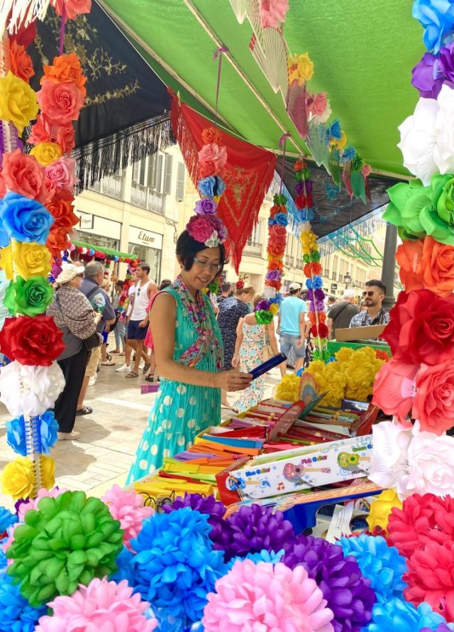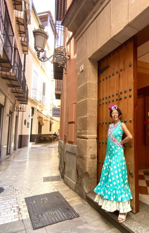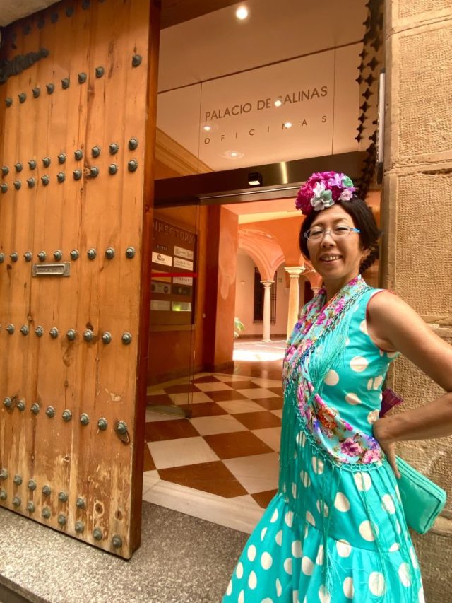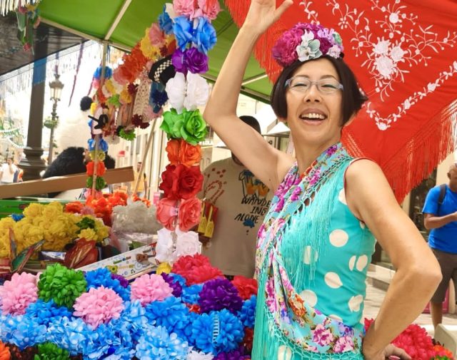 「全身フラメンコ衣装に身を包み、スペイン語でインタビューに答える」