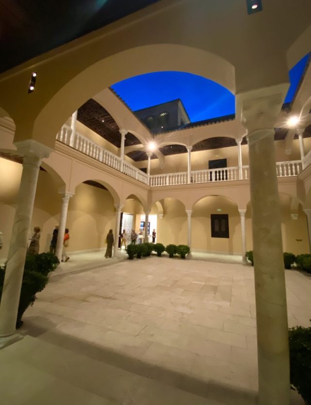 ピカソと血のつながりのある家族かぁ。すごいな。展示室をひと回りした後は、館内にある中庭へ。なんとドリンクのサービスが。さっそく白ワインを手に