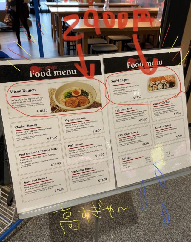 で、搭乗ゲートにたどり着く。あぁあ、フィンエアーにしてよかった。小腹が空いたので、レストランにふらふらと吸い込まれていく。が、日本料理店をのぞいてびっくり。