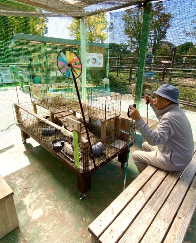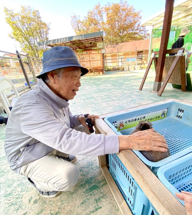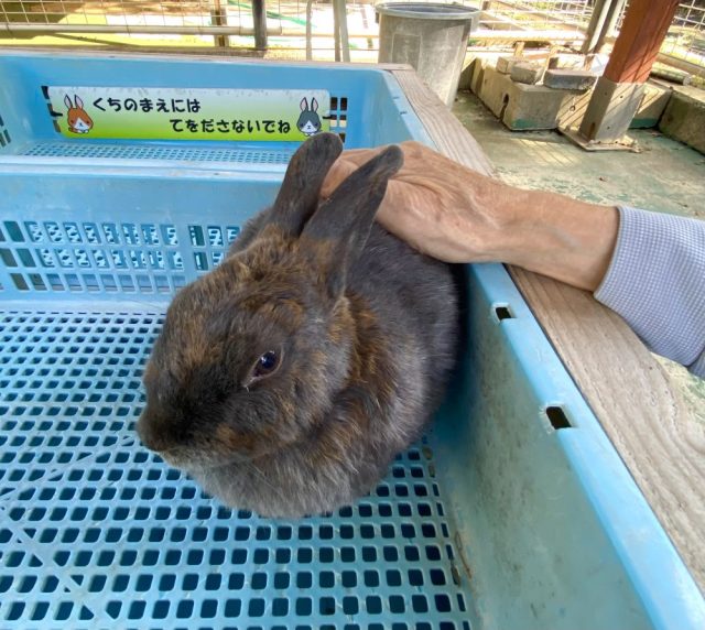 吸い込まれるように柵の中へ(笑)。子供たちに混じって〜。「本当に触っていいんですか?」「どうぞどうぞ〜」。係のお兄さんに優しくうながされ、父の手がそっとウサギの背中に伸びる。