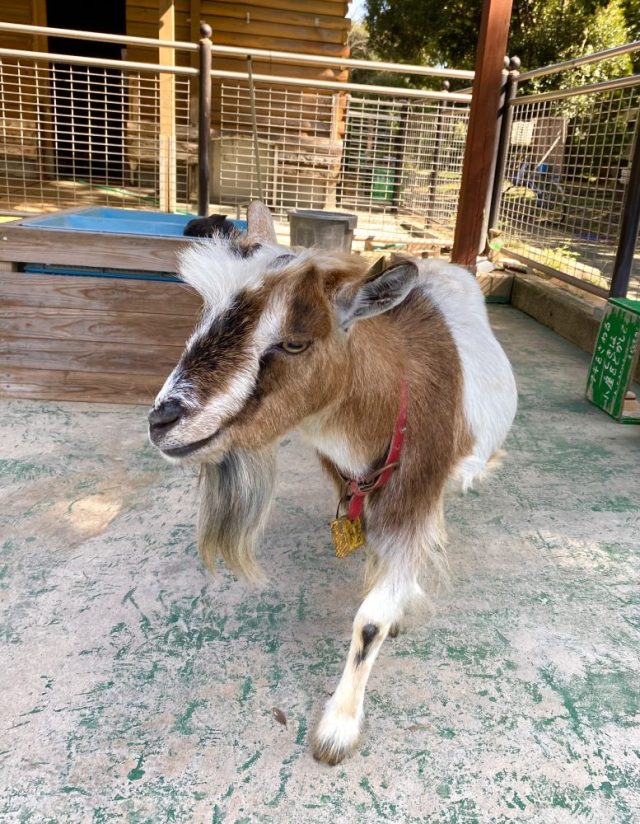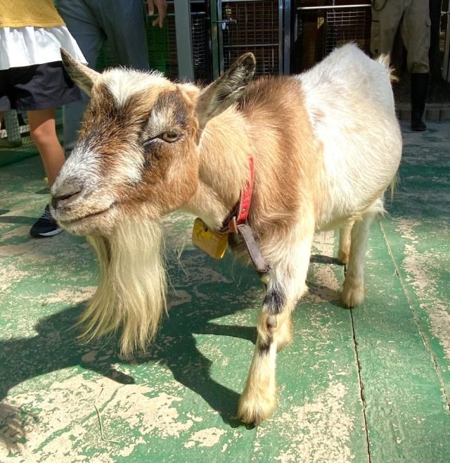 ヤギは元気に動き回っているので、なかなか触らせてもらえない。が、なんとか背中をなでるのに成功。それが、めちゃ剛毛〜(笑)。バリバリバサバサ。知らなんだー。
