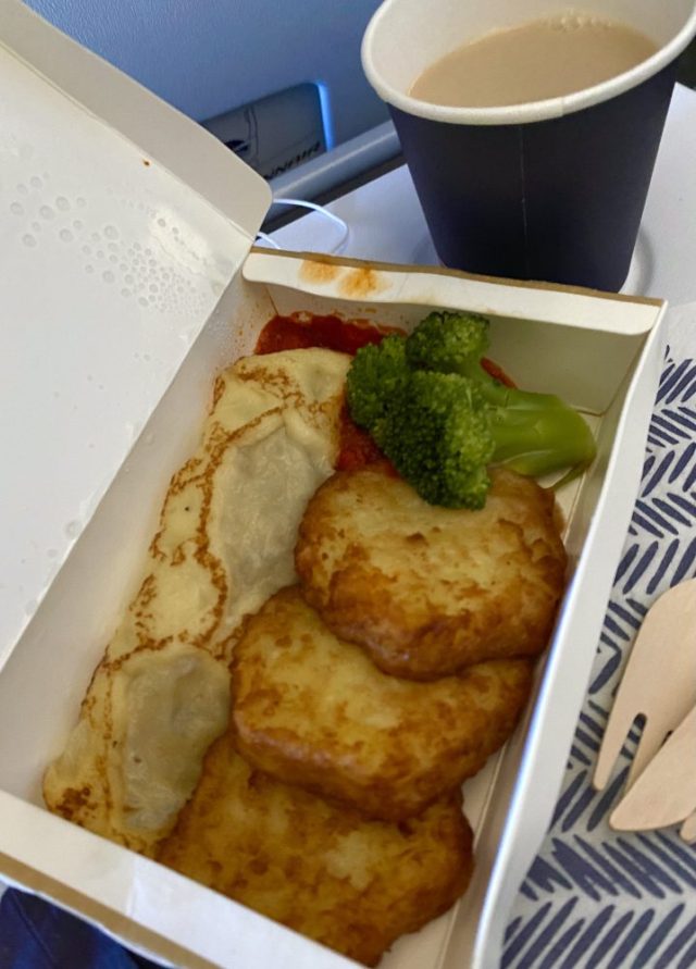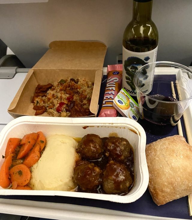 休憩じゃーん(笑)。機内はやはり満席。夕食はミートボール、ポテト、にんじん。キヌアのサラダ。チョコレートバー。