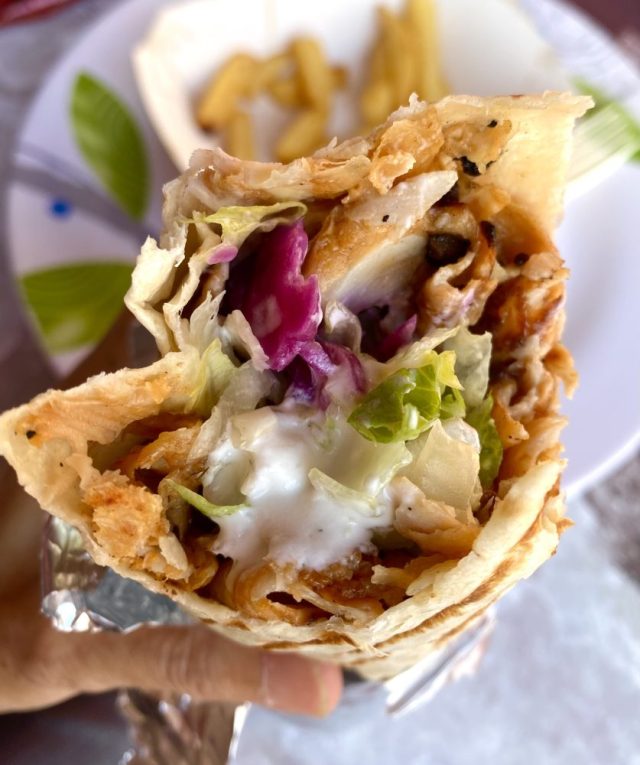 を注文。このドリンクを、ビールにできるのがスペイン。幸せ〜。肉と野菜が薄皮に包まれたシャワルマ。ヨーグルトソースをがんがんかけて、いただきまーーーす!