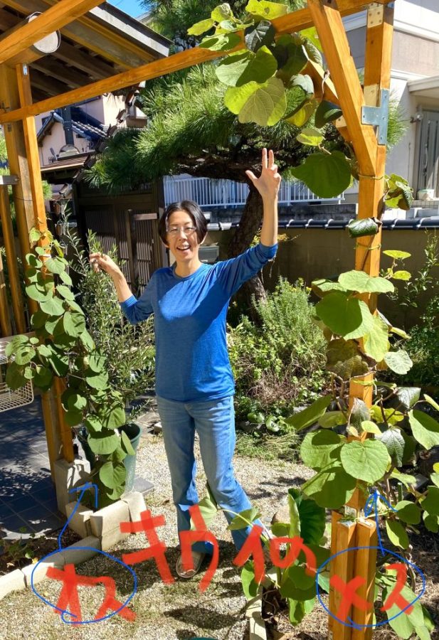 うずくまる父が、なんだか畑の精のよう(笑)。キウィのオスとメスもこんなに大きくなって〜。半年前、日本出発直前まで脚立を乗り降りして、棚を作っておいて本当によかった。とにかく