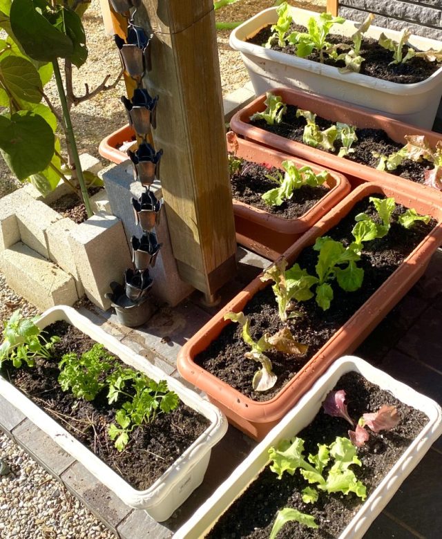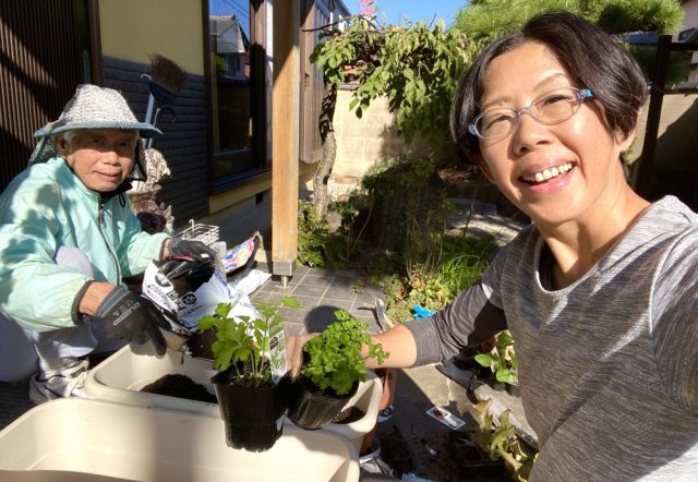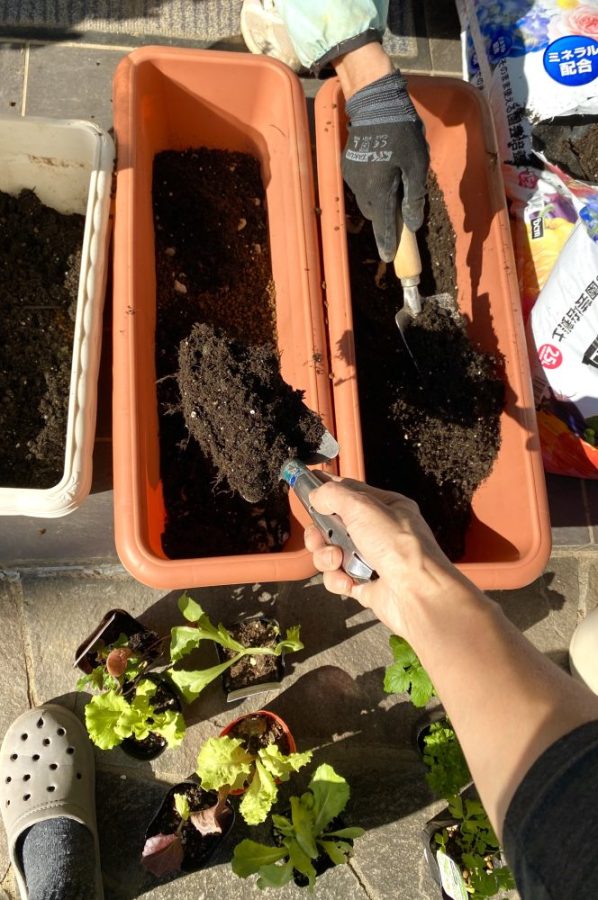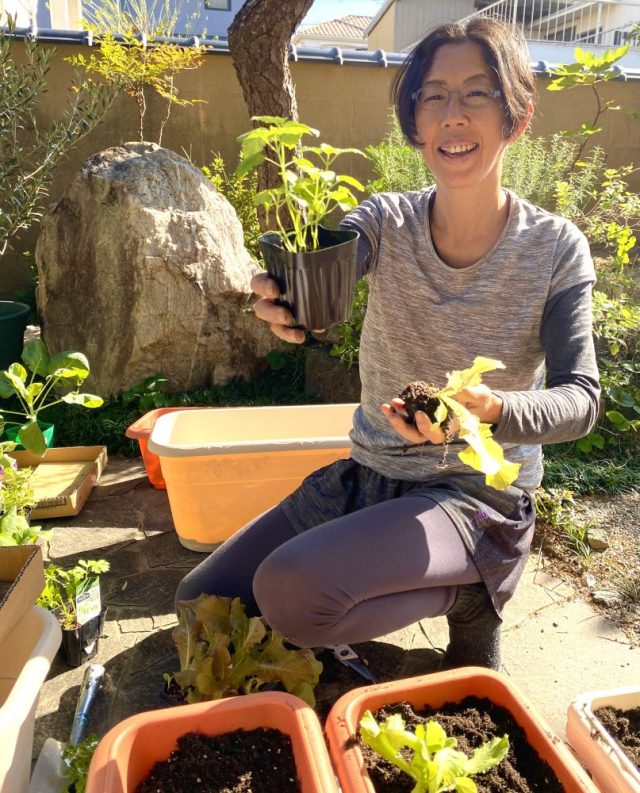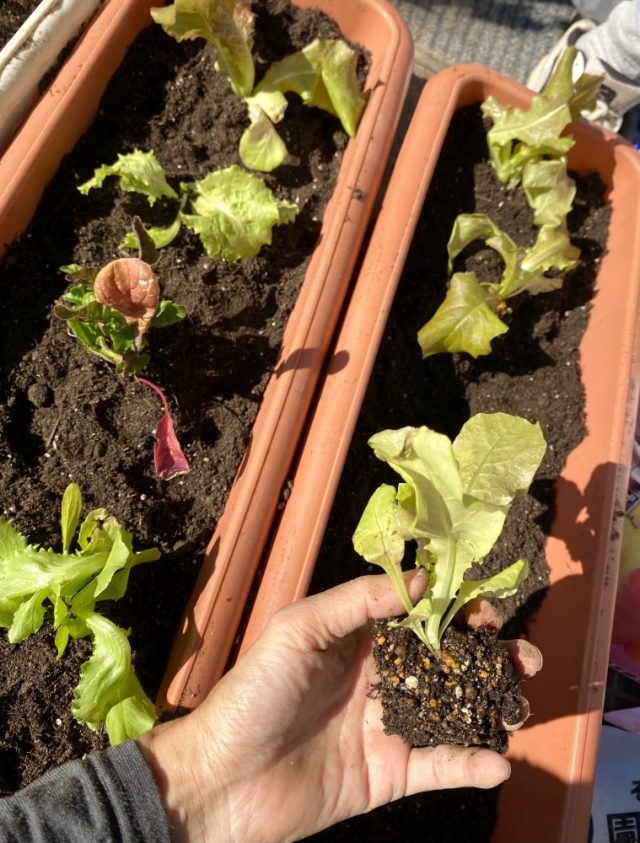 レタス、クレソン、小松菜、パセリ・・・食べられる野菜やハーブの苗をプランターに。これから寒くなるので