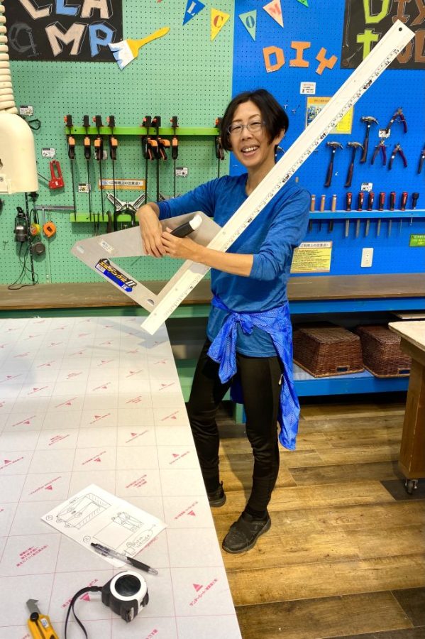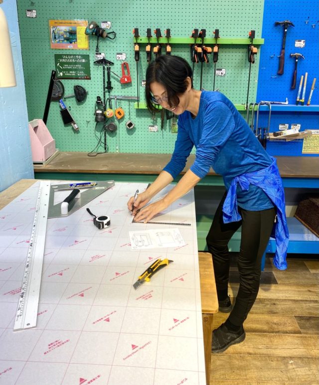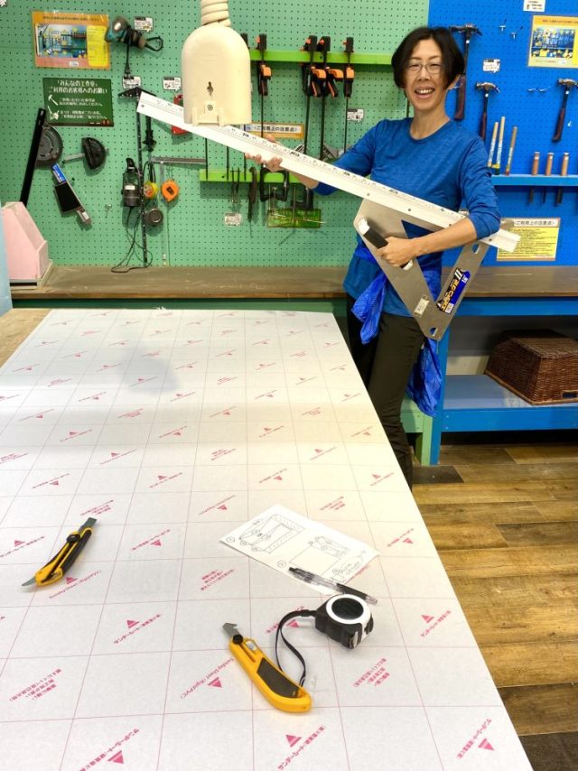 180センチ×90センチ強の板を2枚抱え、店内にある「工作室」へ。無料で使える作業場。道具も全て使い放題。なんてすばらしい〜。これまでに何度も利用させてもらっているので