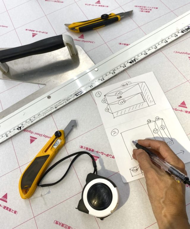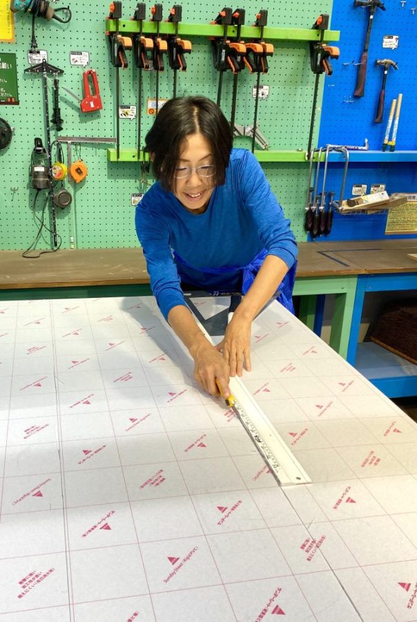 勝手知ったる〜(笑)。壁にかけられた道具の中から、ものさし、カッター、巻尺をゲット。カットするサイズに合わせて、ペンで線を入れる。この白紙の下に、すべすべ透明のアクリル板が隠されているのだ〜。