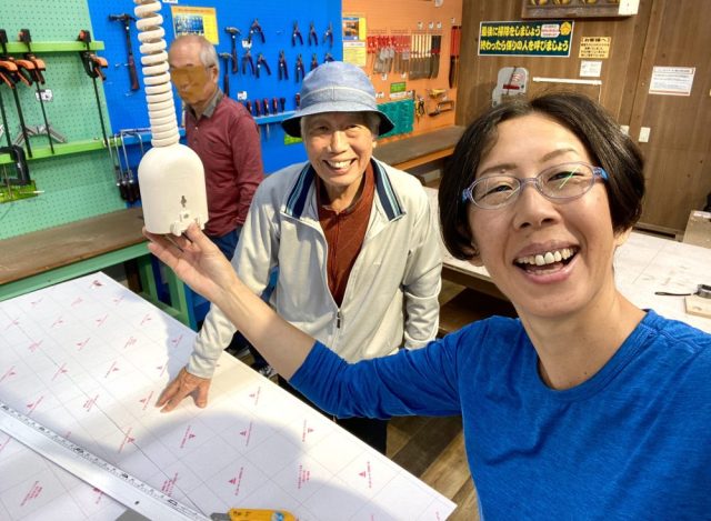 「楽しそうですね〜」「親子工作教室です。家をリフォーム中で」