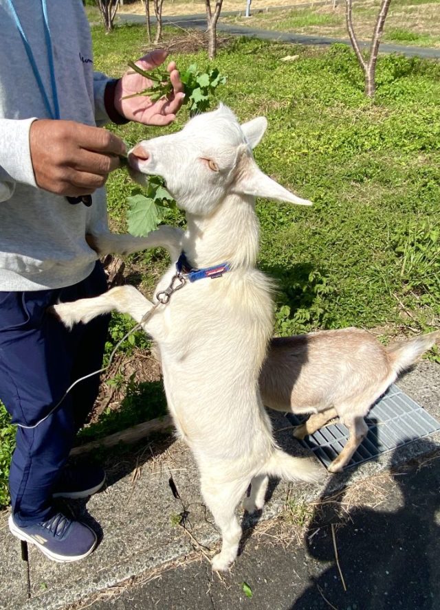 聞けば、田んぼのあぜみちにある葉をつんで、毎日ここへ差し入れに来るらしい。どうりで、ヤギたちが大喜びで駆け寄ってくるわけだ。おじさまの横から私もそっと手を伸ばし