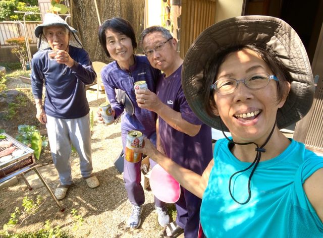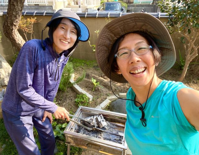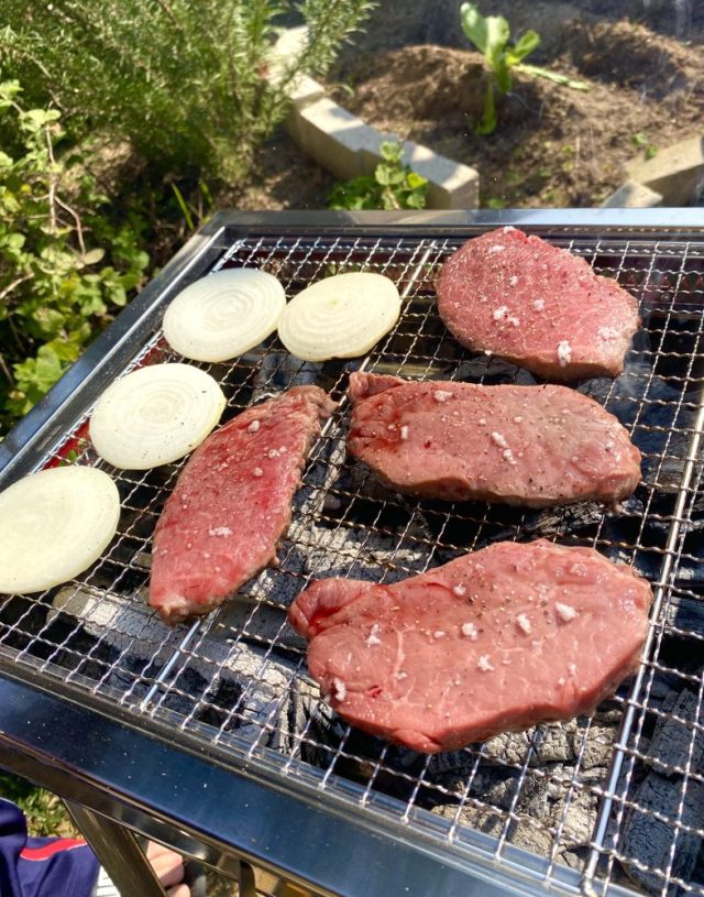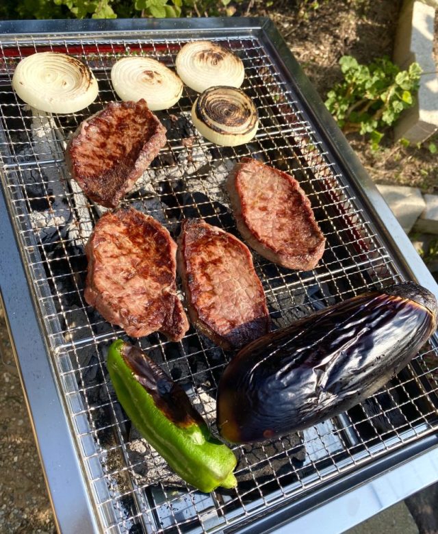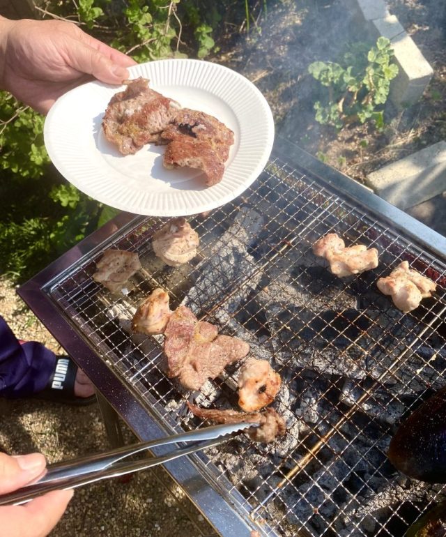 「うちわある?」「油塗る?」「塩どこ?」「もう乗せてもいいね」「こっち焼けた?」「玉ねぎがこげとる〜」「ひっくり返した?」「中まで焼けとる?」「次の肉、乗せるわ」