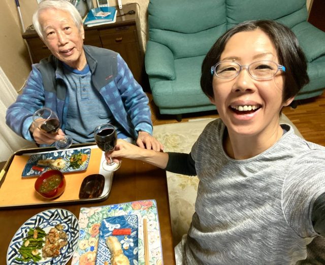 収穫を祝って。夜は夜で、ワインで乾杯。収穫祭だから(笑)。ひたすら祝い続ける〜。歩くと腰や足に痛みが出る父。それでもしゃがむことはできる。座ることも。だから