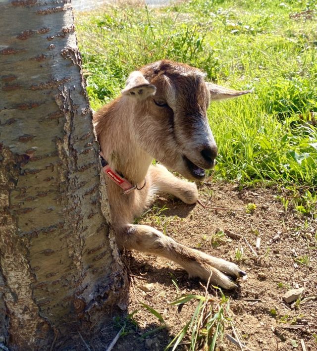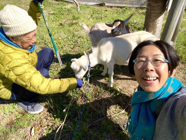 と、頭にキスまでしてくれた〜。あぁあー。感無量。これぞ、ヤギセラピー。本日はマロン(茶ヤギ)は座り込んでうとうと。ひなたぼっこタイムだったのかな。