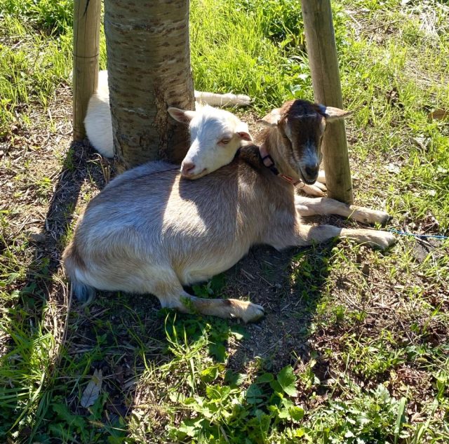 見ているだけで幸せ。2人でくっついて、頭を乗せて。仲良いいんだなぁ。兄弟なのかしら。草っ原に腰を下ろし、太陽の光を浴びながらヤギたちとたわむれる。