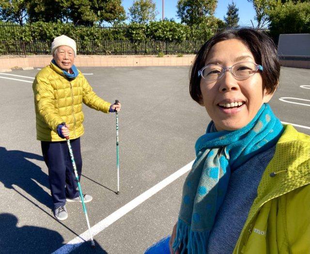 「太陽を浴びながら、ポールで歩いて」