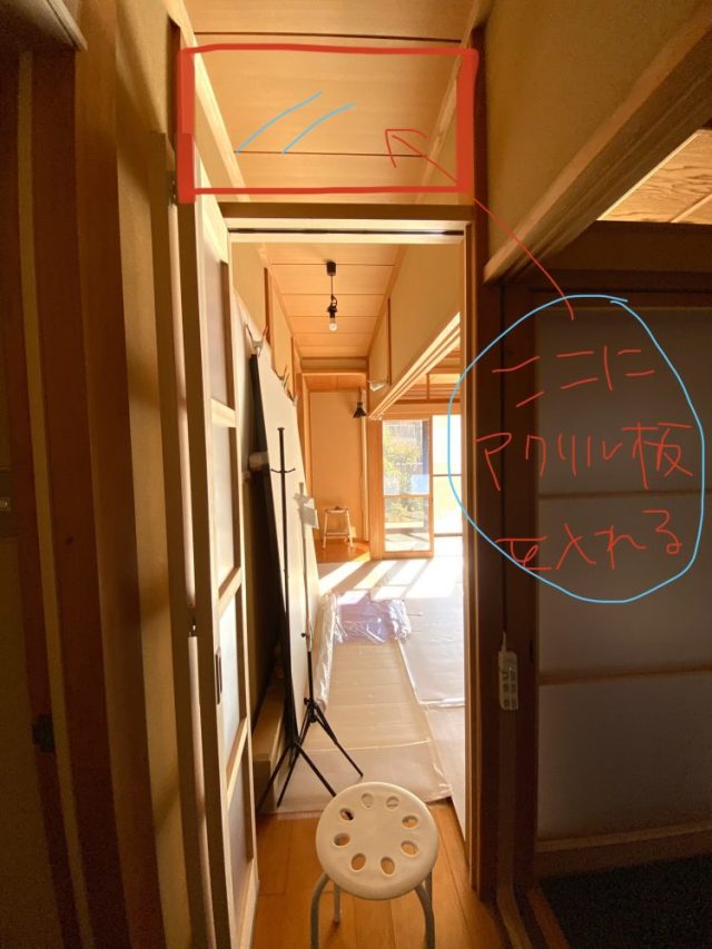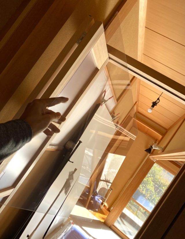 寒波が来る前に〜。まずは、覆っていた新聞紙を引っぺがす。そして、アクリル板を貼り付けるための枠、角材を上下左右にぴったりと入れていく。