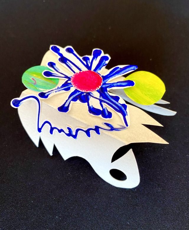 「愛・行動・団結(紅・緑・黄)」3つの玉がひとつに結ばれ、咲く花がある。命を大切にする社会を強く願って。厚紙をカットして折り曲げ、捧げもの台に。