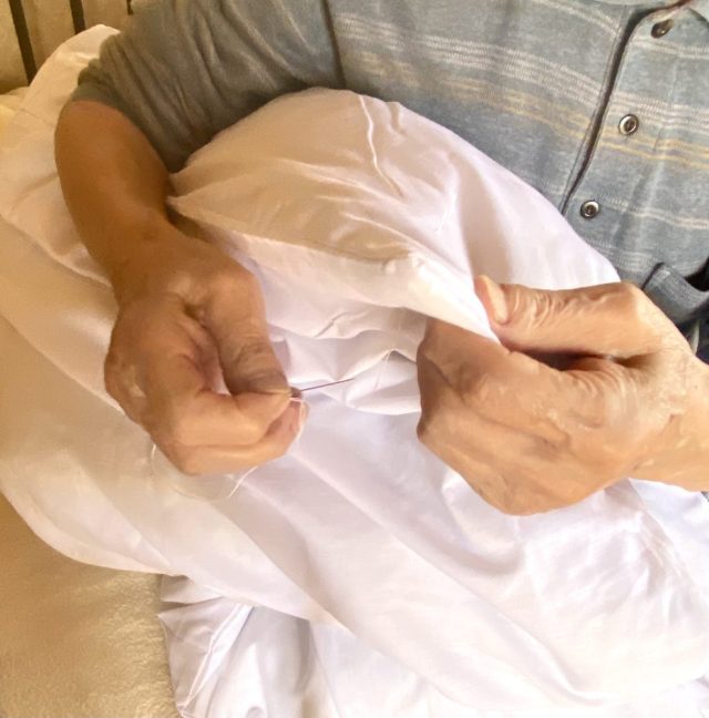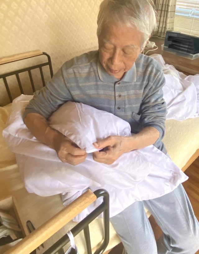 おぉお〜。これで、暖房が入れられる。間に合ってよかった。その横で、父は自分の布団を縫い縫い〜(写真)。今日からいよいよ冬布団に。冬支度は進む。