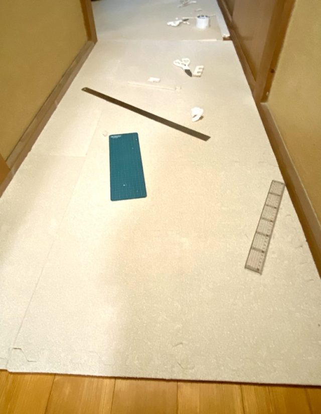 すでに、幸せの予感(笑)。実は最初、ふつうのマットを廊下に置いた。すると夜、暗がりの中で父が床とマットわずかな段差に足を引っかけてつまずいた。その瞬間、即決。