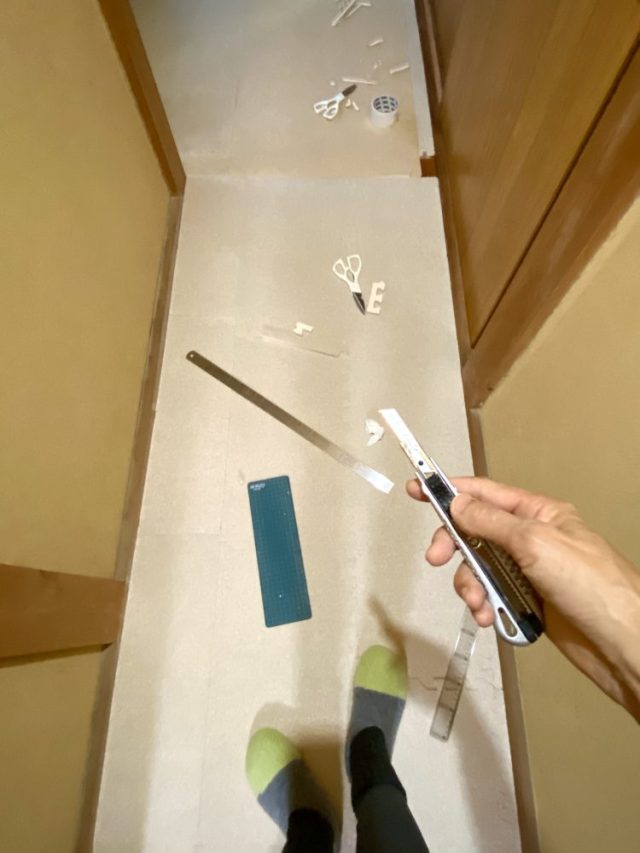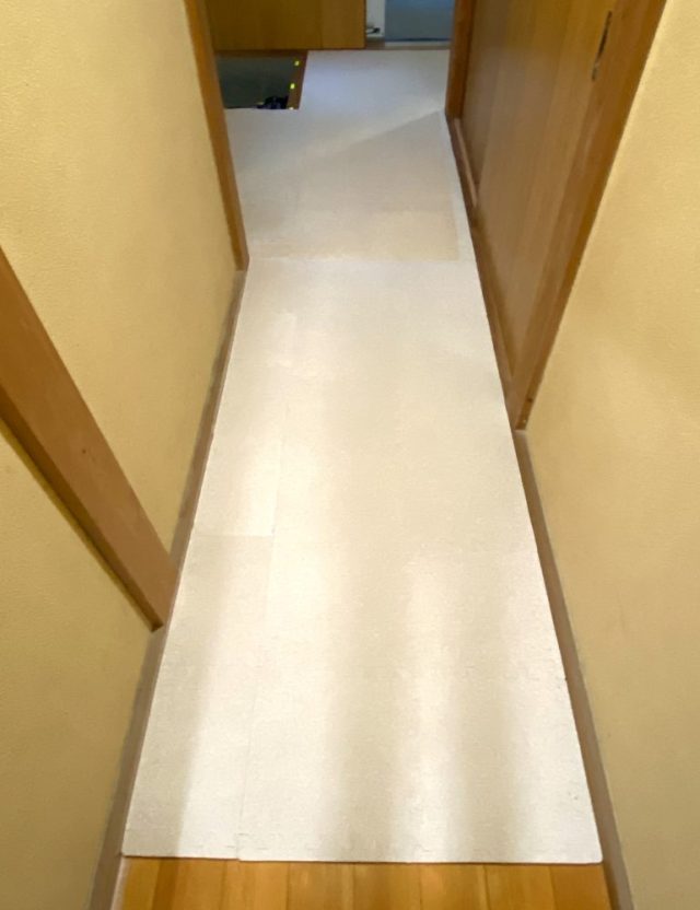 これや〜。ひと手間はかかるけれど、これで端っこの段差がなくなった。めちゃ安心。見た目もいい。色がベージュなので、廊下そのものが明るくなった。
