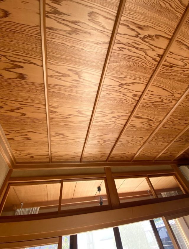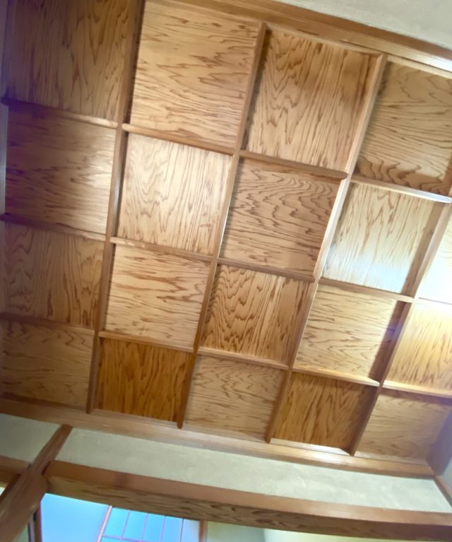 「いい天井だねぇ、本物のムクだ」「今はもう本物のムクは使わんよ」「こっちはスギの天井」「いいねぇ、赤スギは高いだよ」「これはケヤキ」「腕のいい大工さんがやったんだねぇ」