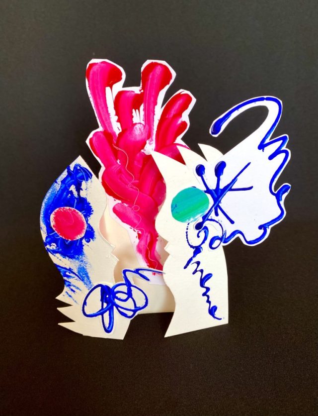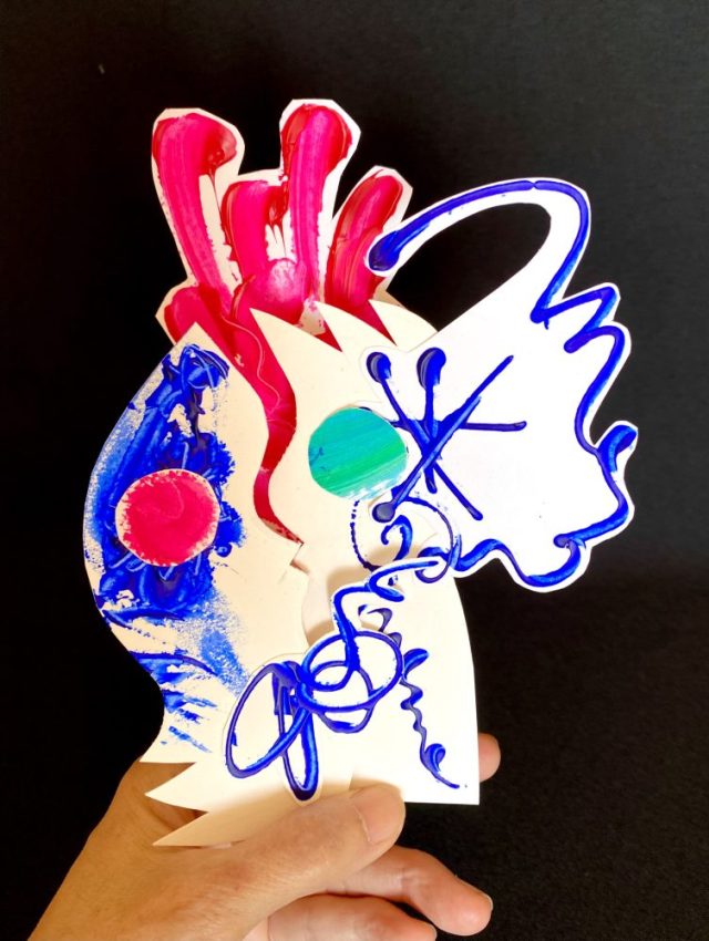 半立体アート。紙を動かすと、左右の顔が接近。ベソ(キス)する仕組み。そこから生まれる情熱の炎、愛の花。