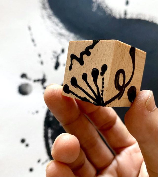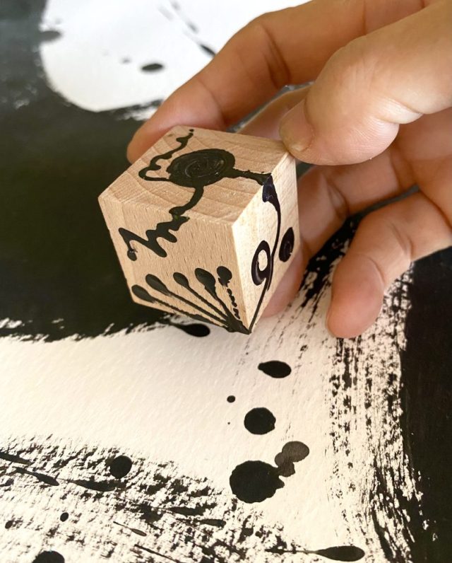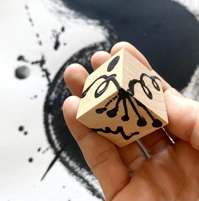 つる、葉、種、芽、根が伸びる。くるくるぐるん。木片にペイント。サイコロアート。