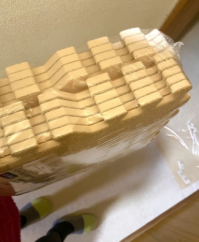 を入手。床に敷き詰めて、カッターで気軽にカットできるプラスチック素材。とりあえず、タイルを覆えば冷気を封じ込められるはず。ひざまづいて作業開始。