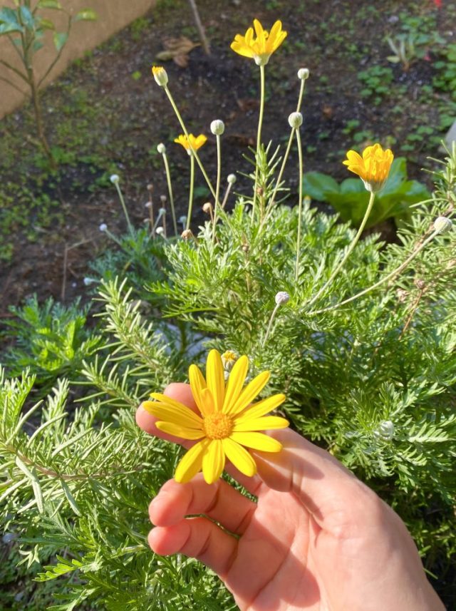 うちの庭の場合、マーガレット。スペインでカプチーノと呼ばれている黄色い花も咲き出した。食べられるので植えてるんだけど〜。季節なのか、気分なのか、人の声に誘われてなのか。