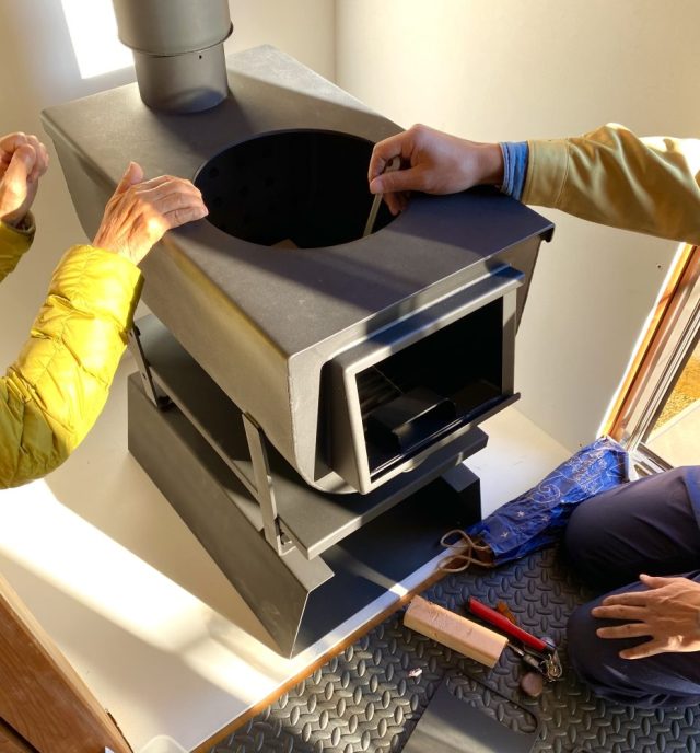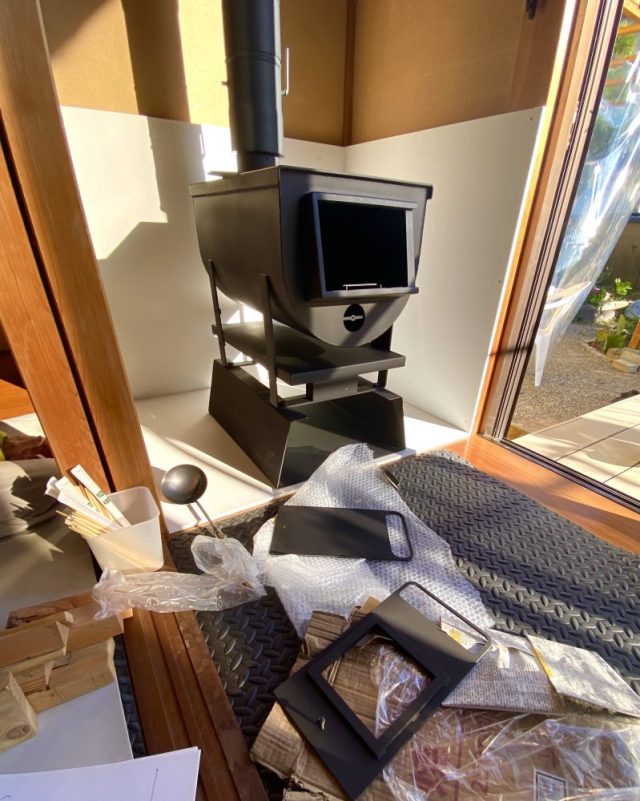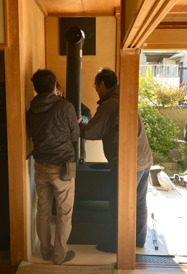 てきぱきと指示が飛び、みるみる形になっていく。プロはすごいなぁ。朝8時スタート。10時半にお茶休憩。さらにお昼1時過ぎまでノンストップ。あっという間に、薪ストーブと煙突ができあがった。