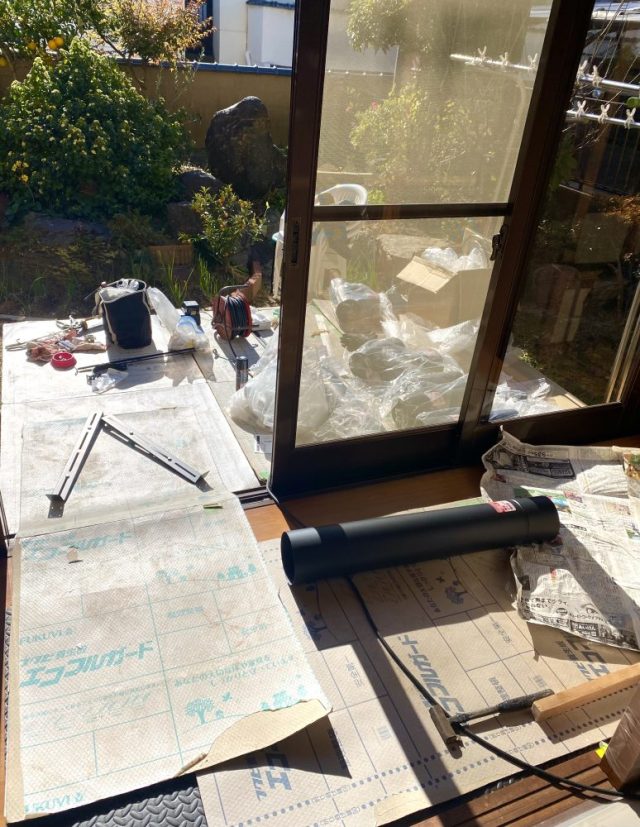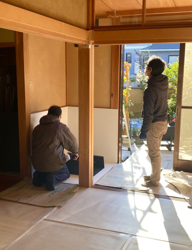 男3人集まれば〜。どんどん作業が進んでいく。頼もしいー。効率を考えれば、部屋の真ん中に薪ストーブを置いた方が暖房効果は高いのだけど