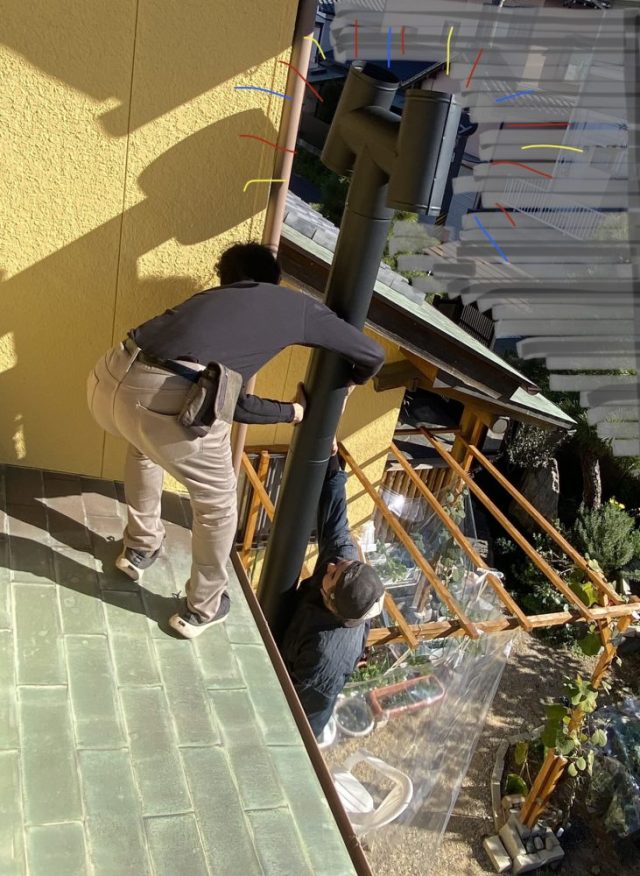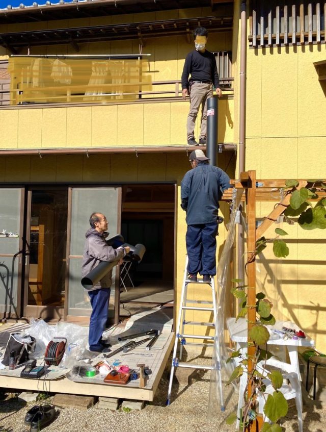 の一角に。室内部分、壁の貫通部分、外側と作業は進む。脚立や屋根に登り、煙突を抱きかかえ・・・