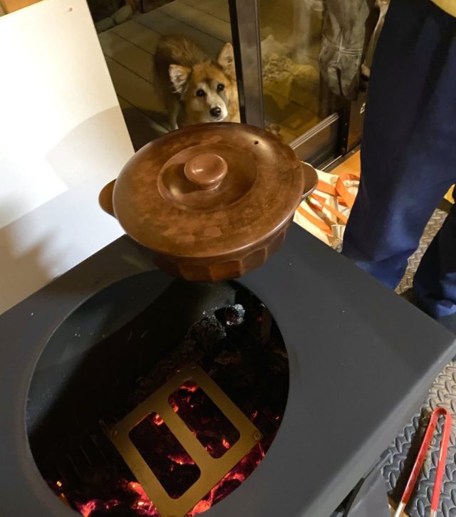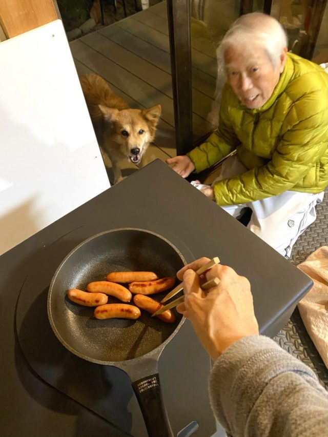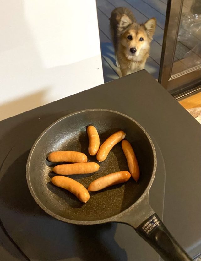 きっぱり。薪ストーブの上で沸かしたお湯で、ひきたてのコーヒー。なんかめちゃおいしく感じる。フライパンでウインナーを炒めたら、ワンコがすぐに反応。