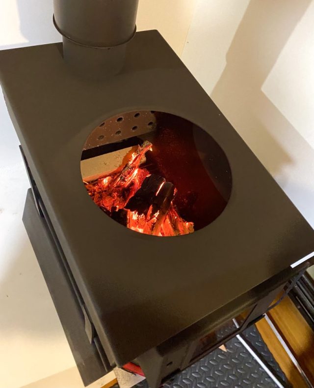 【一日一作プロジェクト】「夜窓シリーズ」を作った(2022年の作品を紹介中)。昨日の続き。薪ストーブの火が力強く燃え上がる。