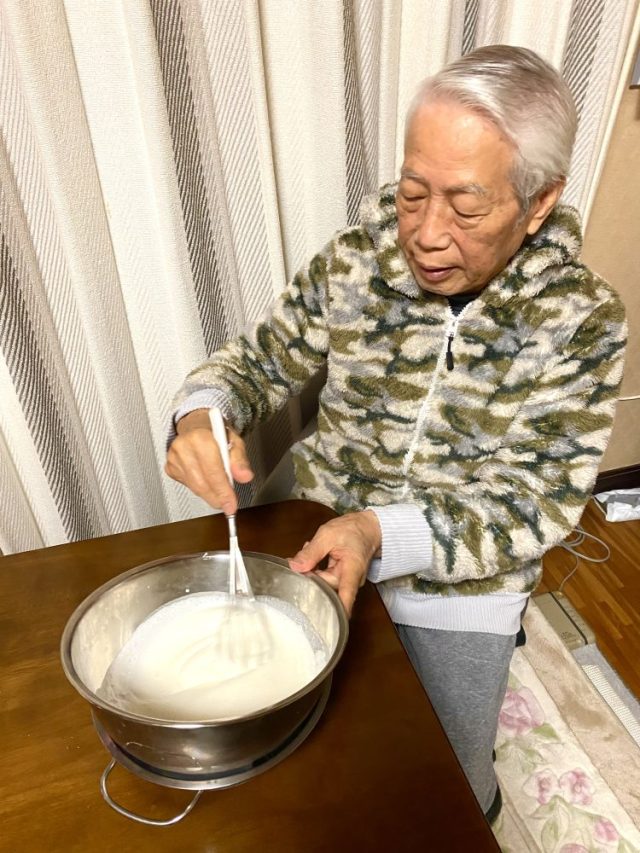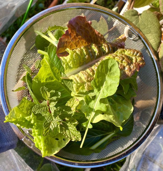 父にさっそく、生クリームの泡立てにトライしてもらう。その隙に庭へ。サラダ用&飾り用のリーフ類を摘み取る。この日のために買っておいたパネトーネ、国産ワインを取り出して・・・