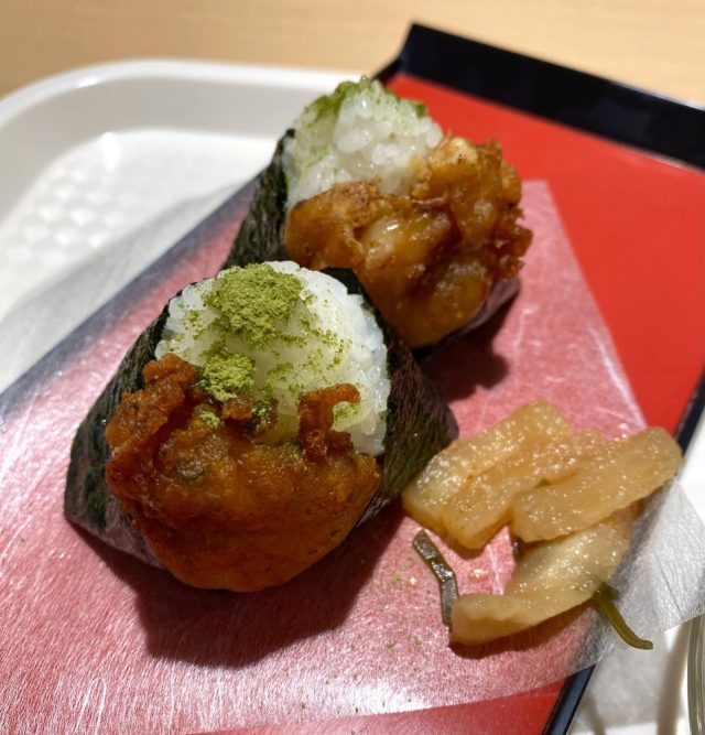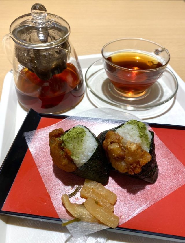 生クリームを泡立てるための氷、冷凍庫にあったっけ?などと考えながら、カフェテリアで遅めのランチ。とりあえず天むす&紅茶でひと休み。